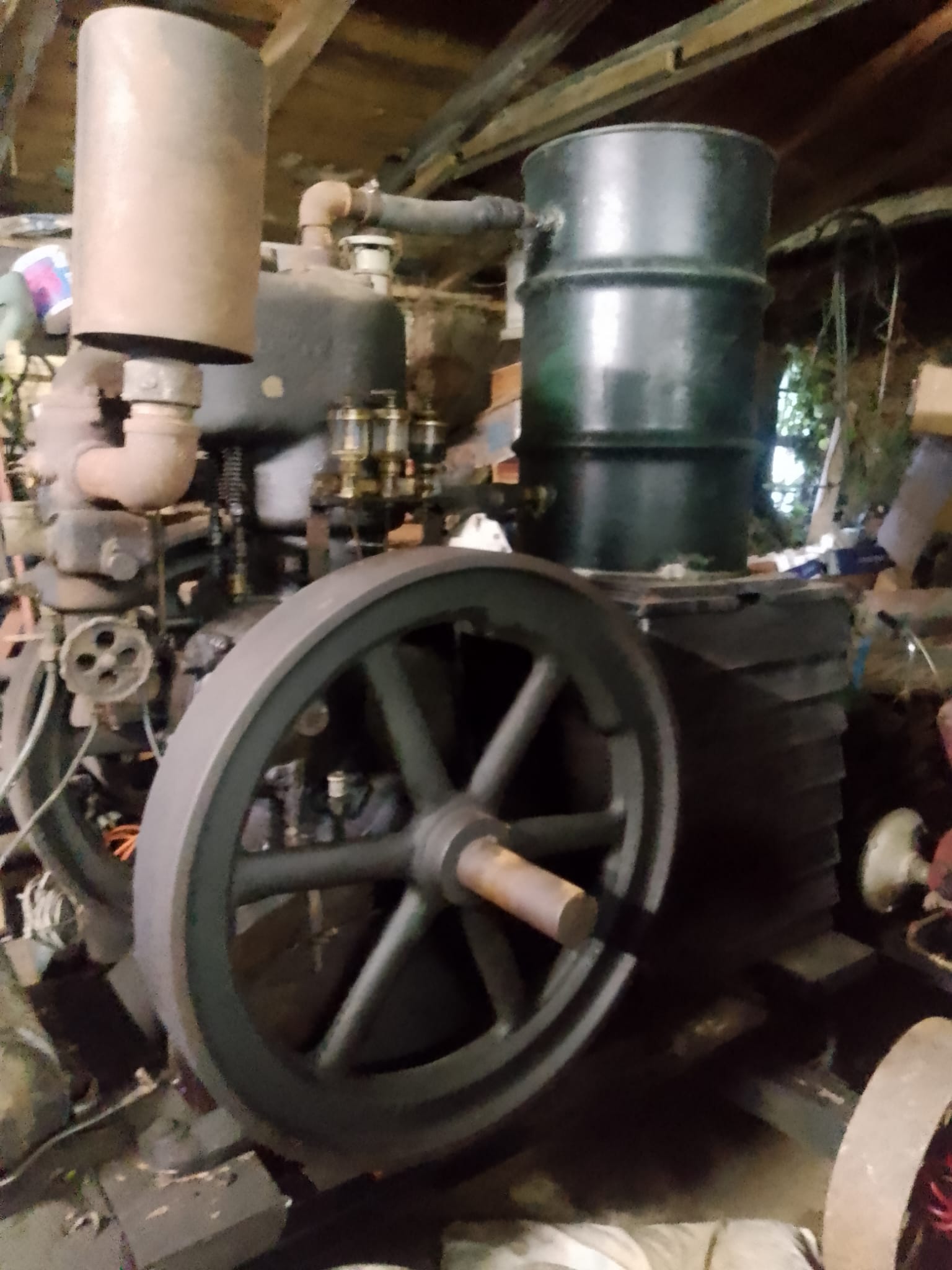When we arrived at the old workshop, upon opening the door, it looked to be full of timber and years of junk piled in. We found a path to the bottom of the workshop past several woodworking machines, in the very corner at the bottom of the workshop sat a mighty Lister Q type, sat on a 2 foot high concrete block.What a beautiful sight! We were told that 2 local engine clubs had turned it down due to its size and it being sat on the concrete block.